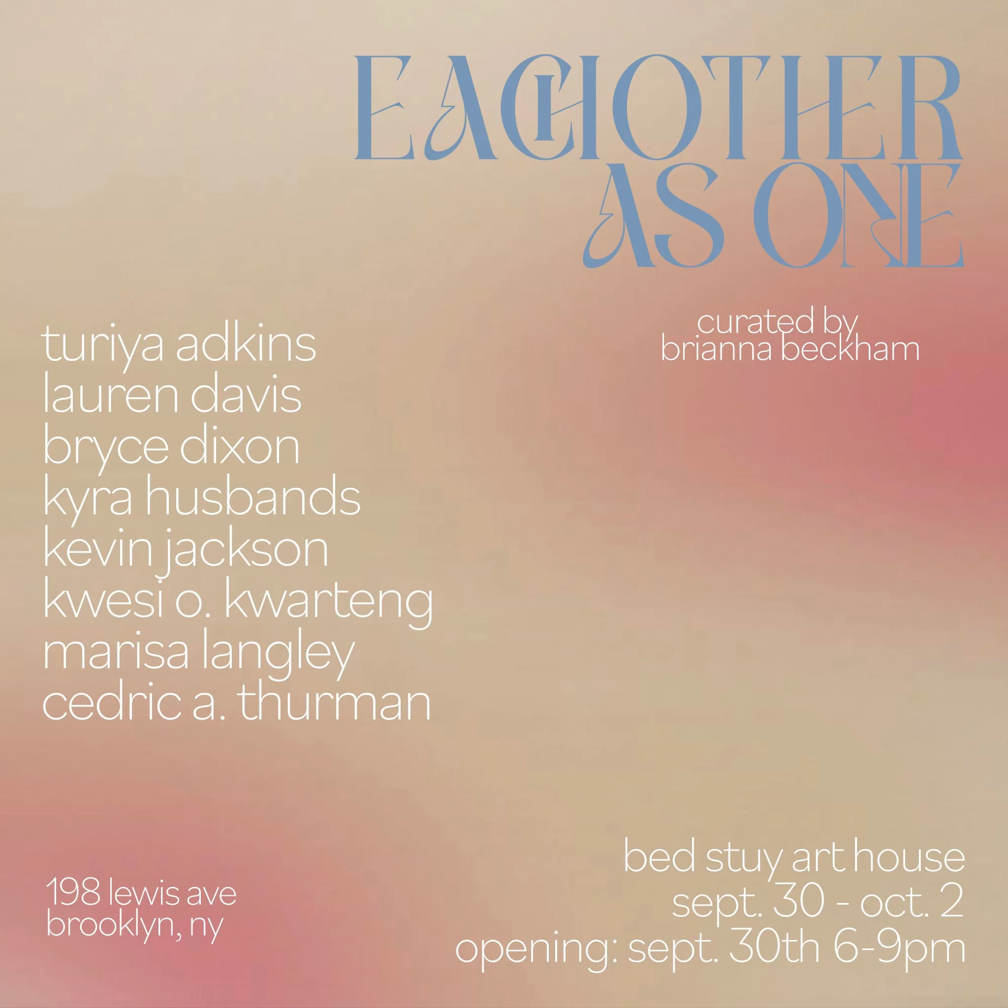 Each Other As One Oct 6 Written By Kyra Husbands Each Other As One Group Exhibition September 30th- October 2nd 2022Curated by Brianna Beckham Featured Works Kyra Husbands