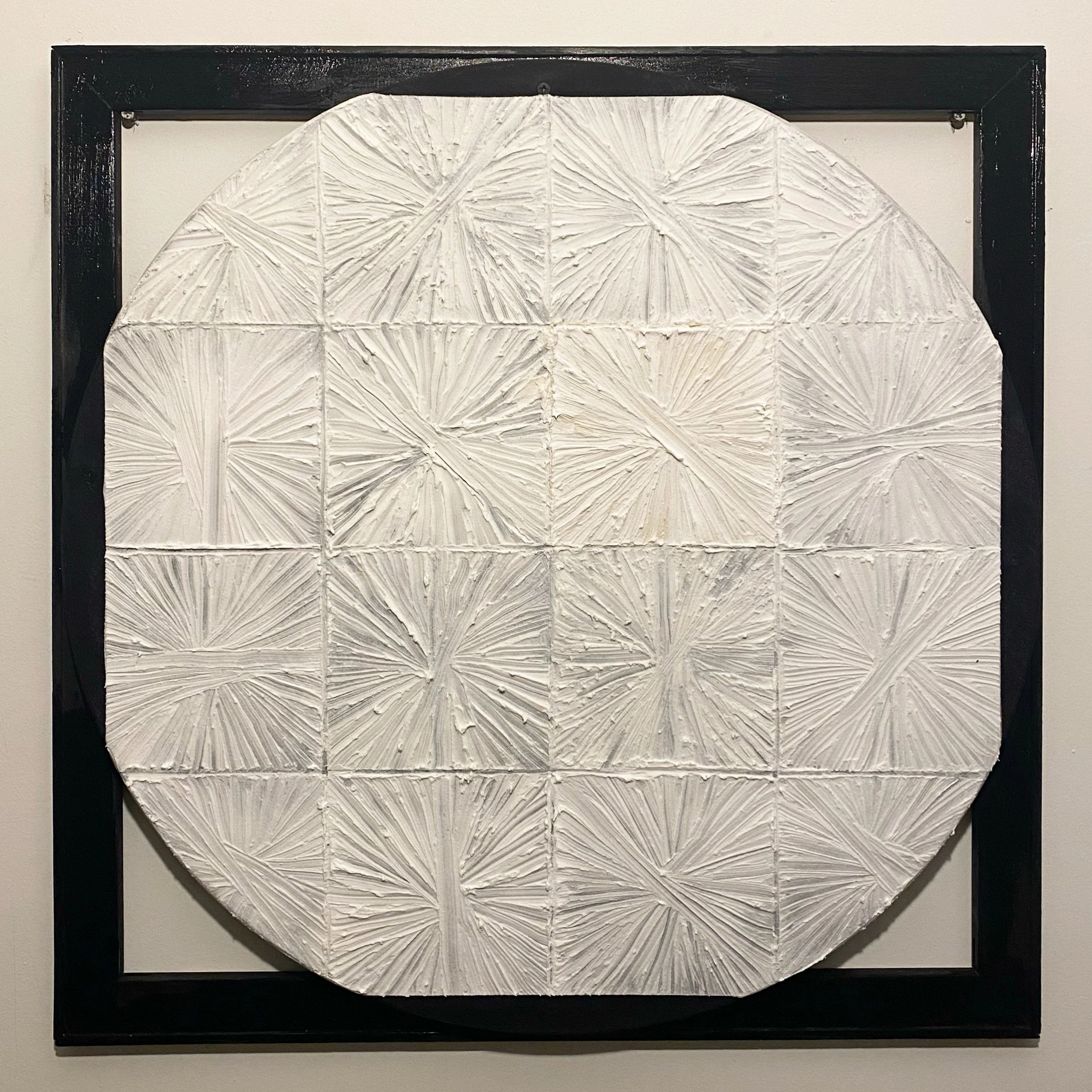 "Cut it out. Hang it up. Go home." 2022 wood, plaster, acrylic 24 3/4 x 24 3/4" stretcher bars