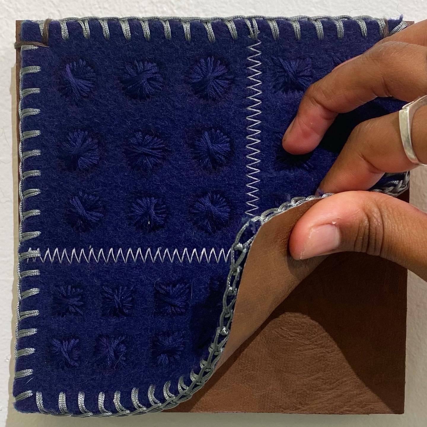 "I fly no flag/ my skin my logo" 2021, felt, faux leather, embroidery, acrylic, 6x6" wood panel