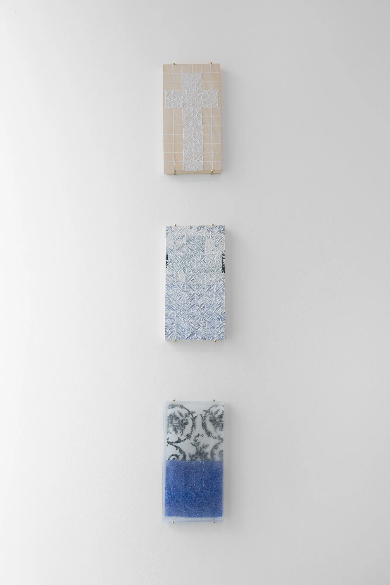 "Superphysical High, Material Below", 2022 molding paste, acrylic, fabric 6x 12" wooden panel