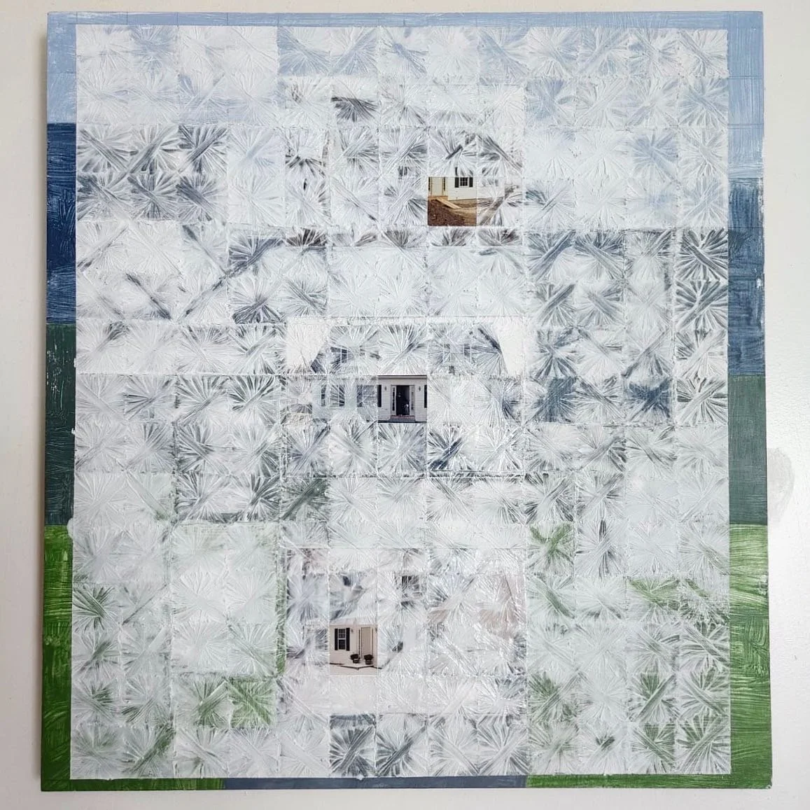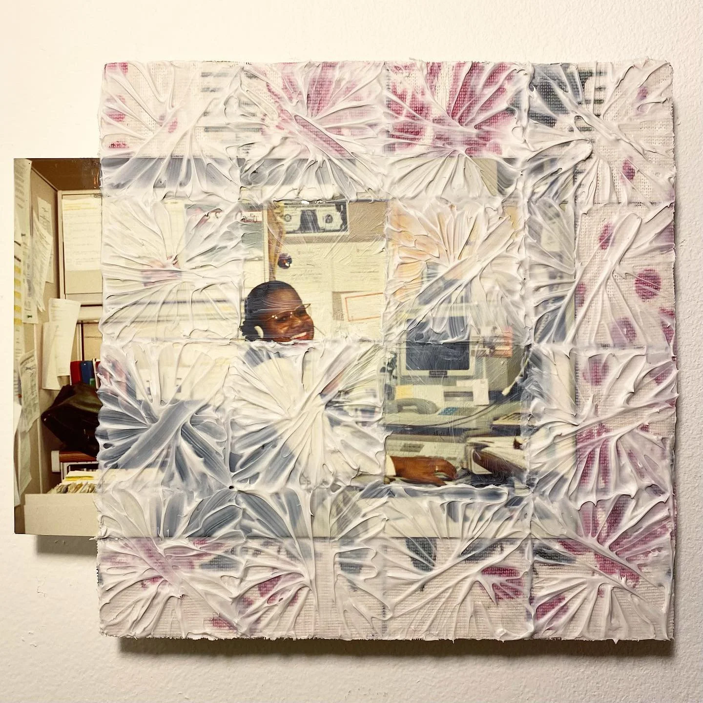 "My Family Home. Beacon NY 1998" 2022, molding paste, archive family photographs, acrylic, 19x 17.5" wood panel