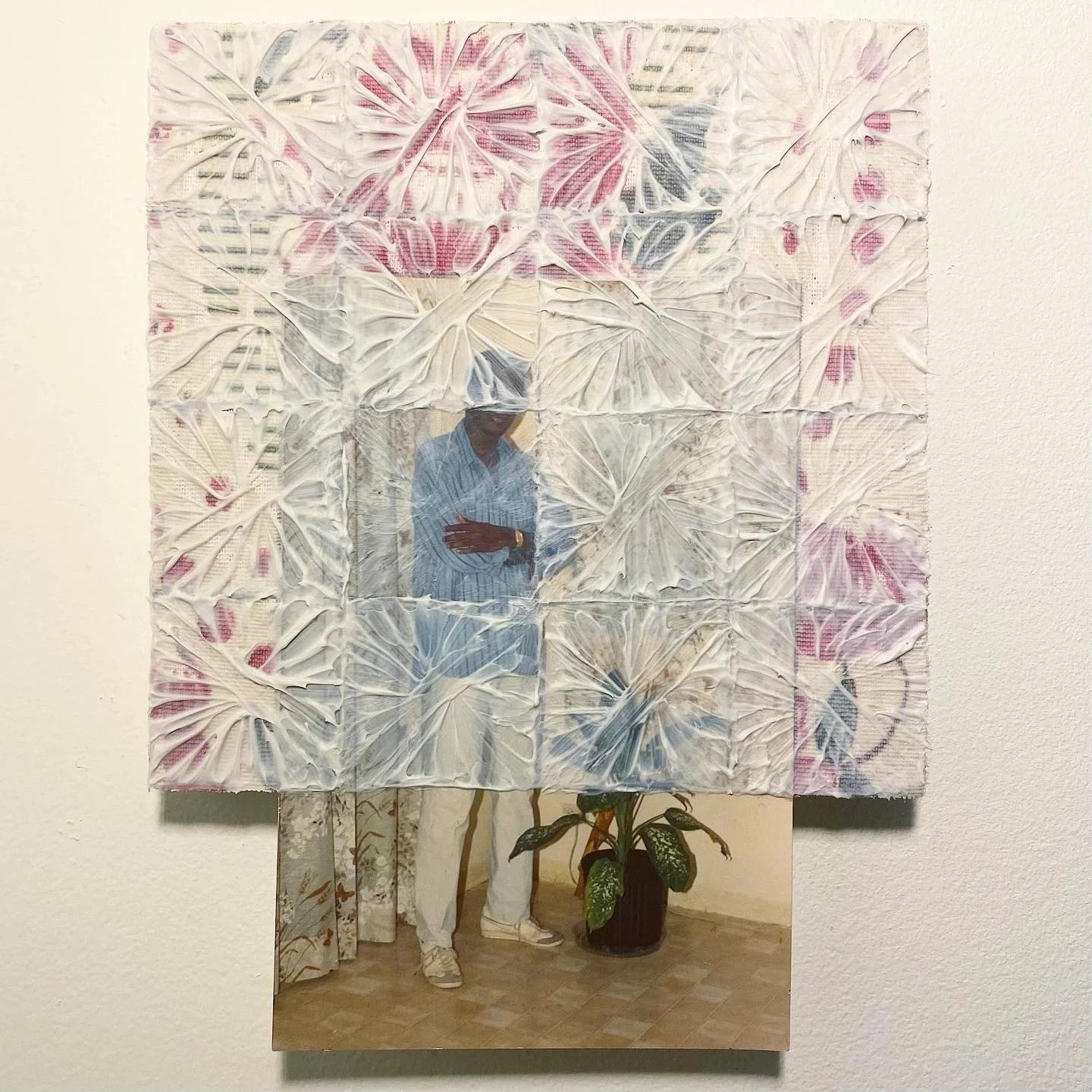 "No face. My Father Kenvin Husbands" 2021, molding paste, archive family photograph, fabric, acrylic, 6x6" wood panel