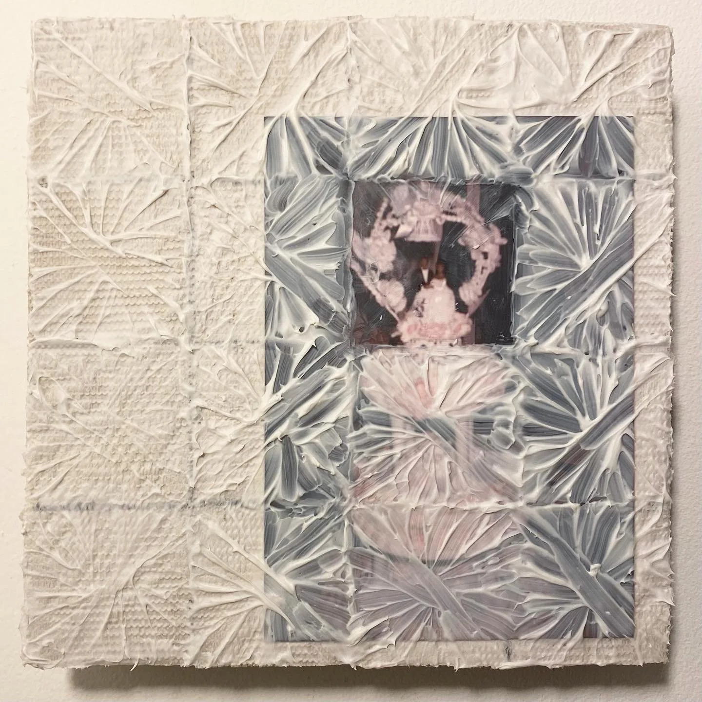 "Sugar Lace" 2021, molding paste, archive family photograph, lace, acrylic, 6x6" wood panel