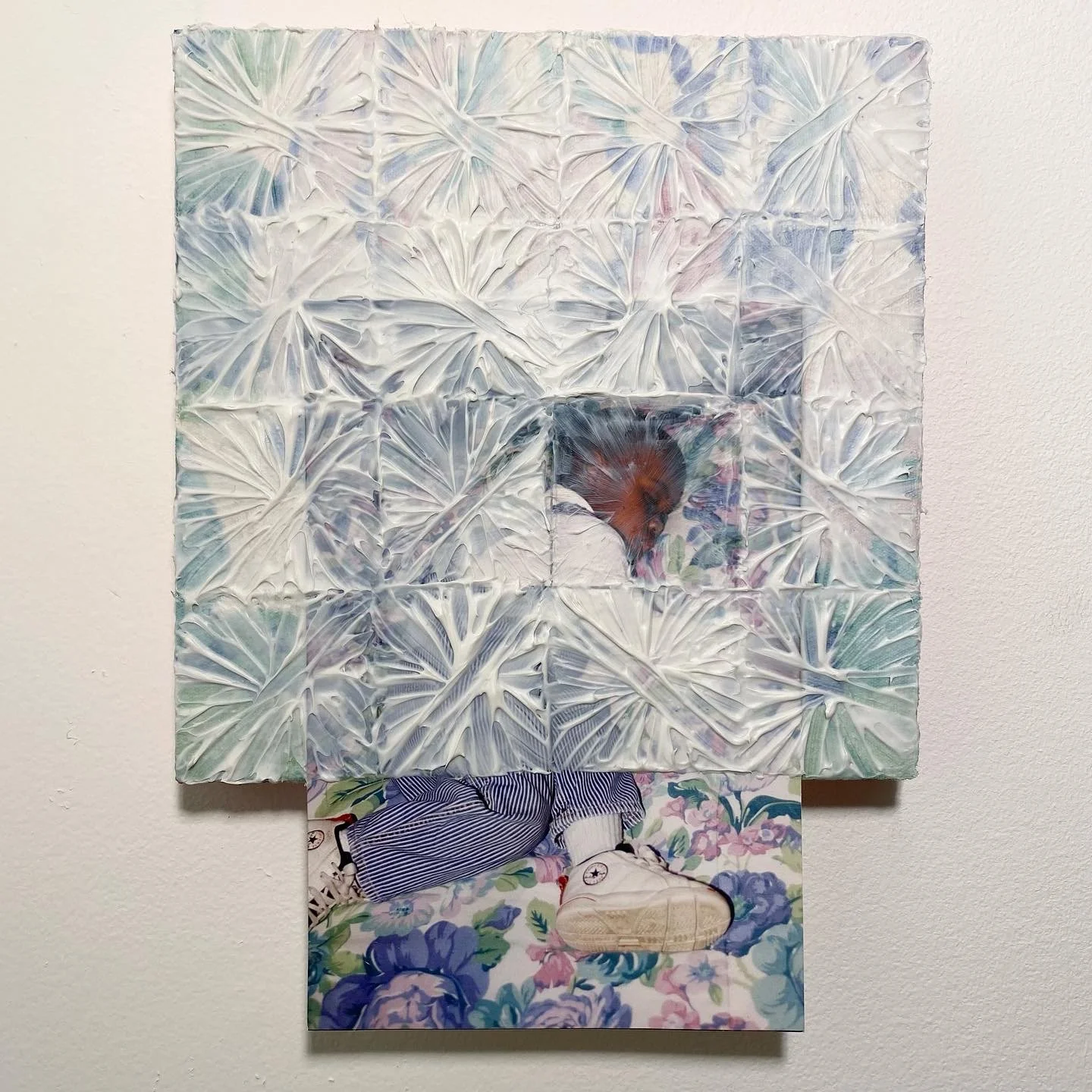 "Kamron Sleeping, framed" 2021, molding paste, archive family photograph, fabric, acrylic, 6x6" wood panel
