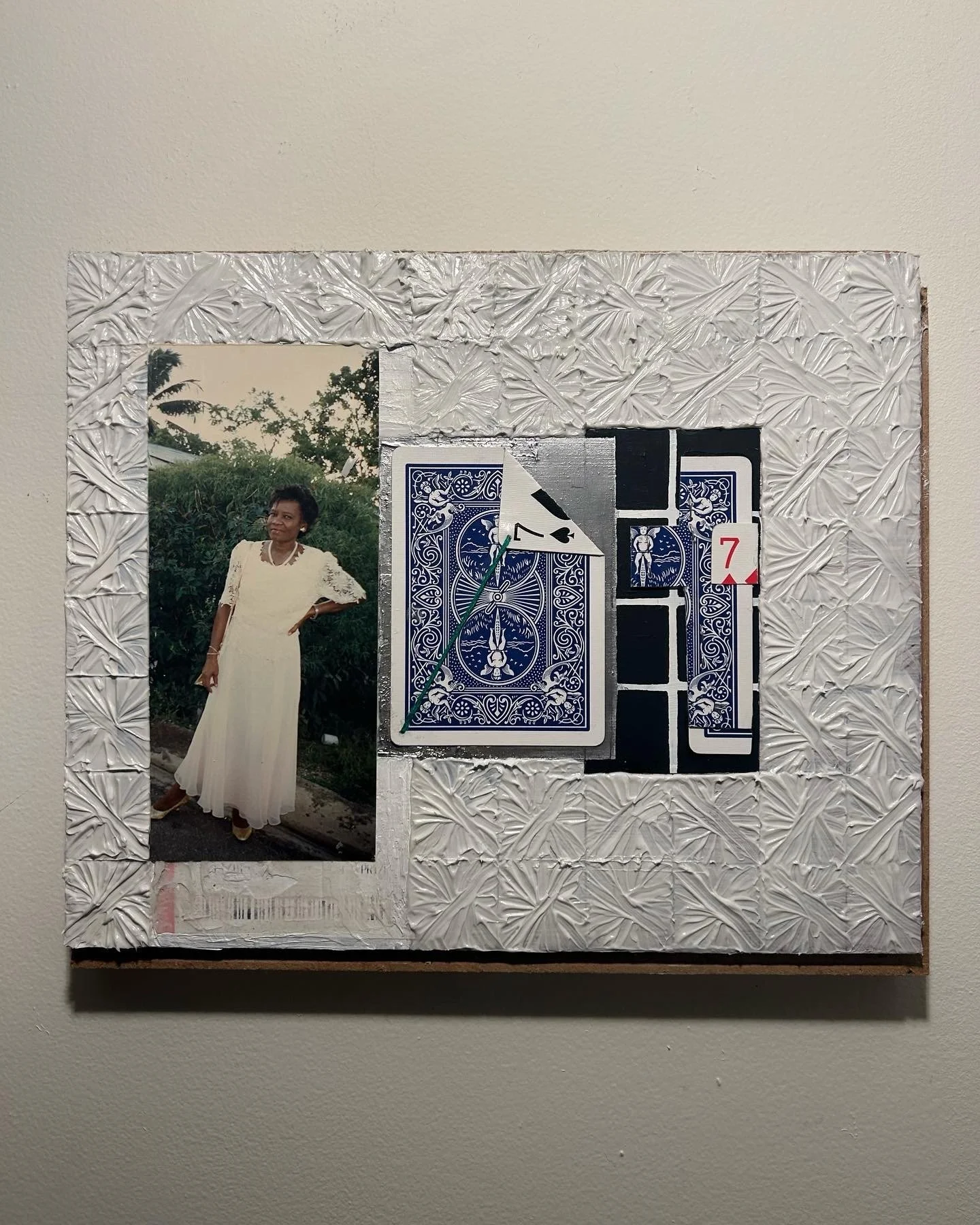 "Seven over everything” 2023 Molding paste, archival family photographs, Mega Million lottery tickets, playing cards, flashe paint, embroidery floss on repurposed wood. 8.5x 10”